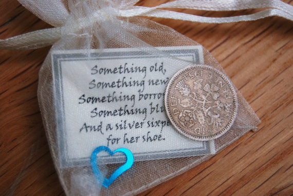 Na szczęście dla Panny Młodej: zgodnie ze zwyczajem Panna Młoda powinna mieć na sobie coś nowego, starego, niebieskiego oraz pożyczonego. Oto wszystkie przedmioty zebrane w jednym woreczku! Wystarczy dołożyć do środka coś pożyczonego. Z pewnością to bardzo wygodne rozwiązanie.