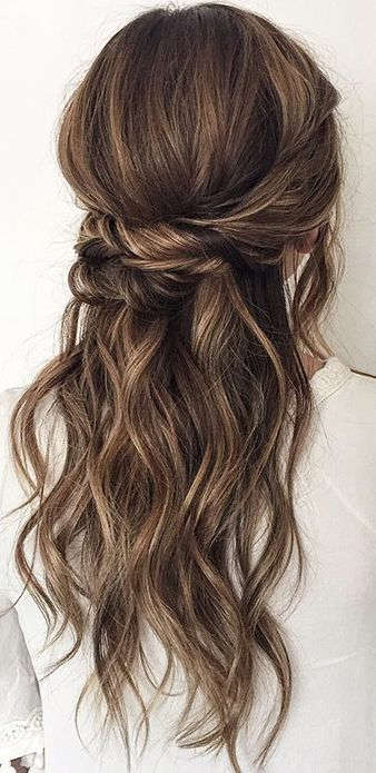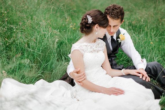 Na pierwszej fotografii mamy przykład klasycznej, prostej fryzury. Przepiękne, długie włosy, lekko pofalowane, delikatnie spięta górna część włosów. Nie da się zaprzeczyć, że jest to klasyczna, prosta fryzura, zarazem pełna uroku i wdzięku. Panny Młody z długimi i zadbanymi włosami z pewnością powinny zastanowić się właśnie nad takim uczesaniem. Fryzura jest tak lekka i delikatna, że w zasadzie nie są potrzebne żadne ozdoby, które mogłyby dać odwrotny efekt, przytłoczyć fryzurę, sprawić, że efekt fryzury byłby zasłonięty przez sztuczny dodatek. Wbrew pozorom bez zastosowania żadnego dodatkowego elementu można stworzyć wyjątkową, piękną i prostą fryzurę. Takie upięcie włosów idealnie będzie komponować się z sukniami delikatnymi, prostymi, gdzie nie ma zbyt dużo dodatków. Jest to idealna fryzura do prostej sukni z dekoltem na plecach.