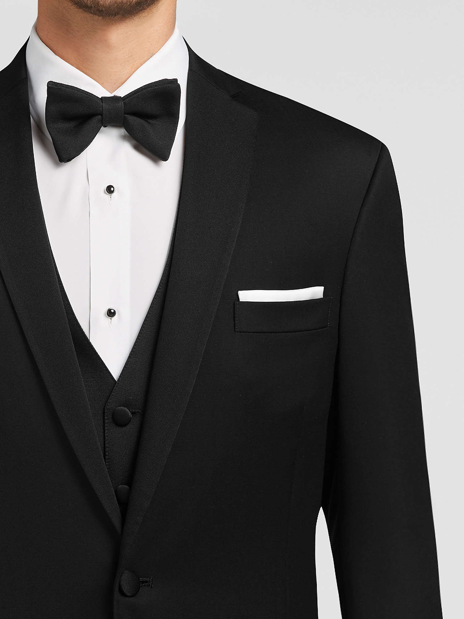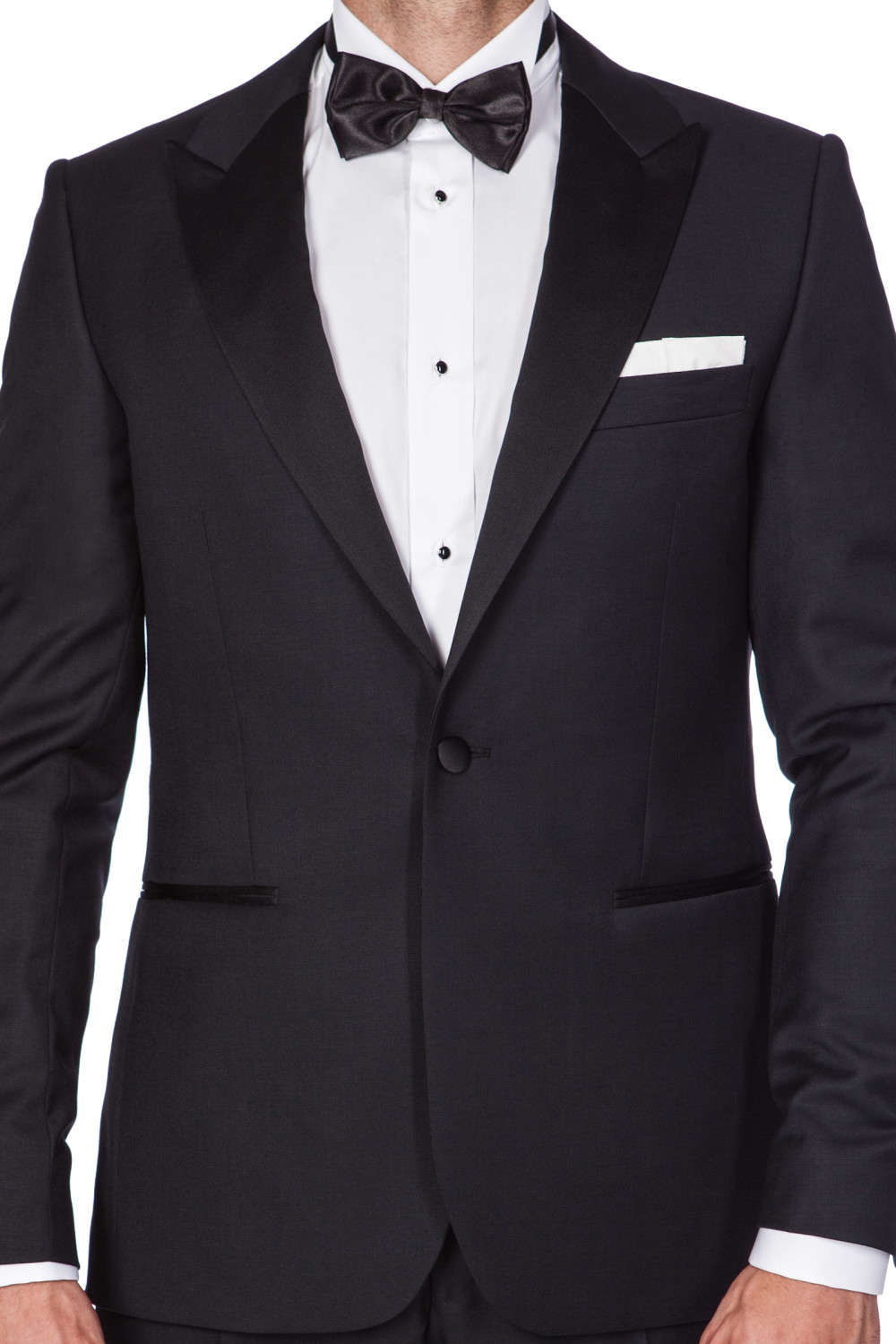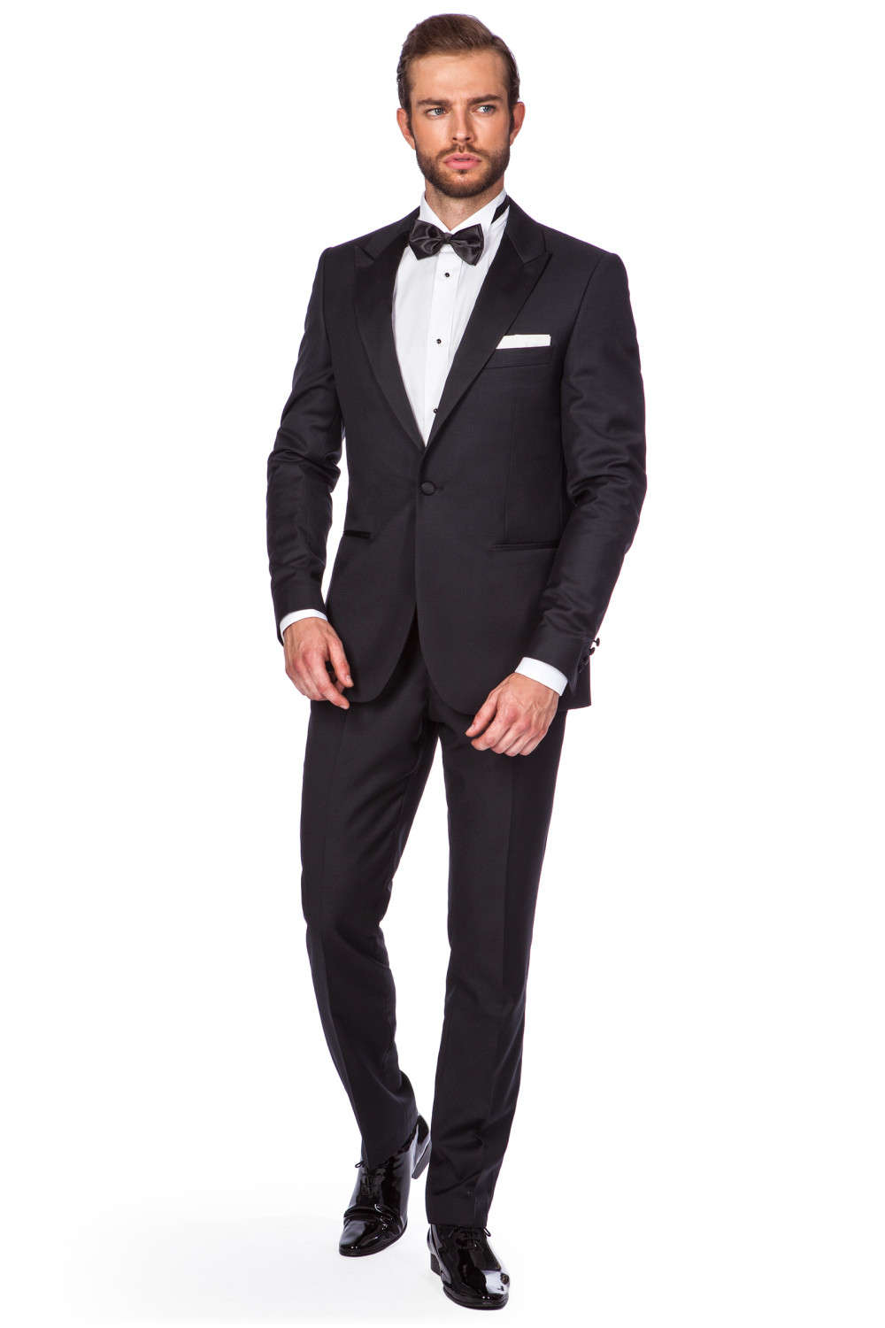 Klasyczna stylizacja – granatowy, wizytowy garnitur + biała koszula + czarna muszka + czarne buty. Nie da się zaprzeczyć, że z jednej strony jest to klasyczna stylizacja, natomiast z drugiej strony na uwagę zasługują czarne obszycia, które od razu zwracają uwagę. Z pewnością jest to jedno z ciekawszych rozwiązań. Tutaj ważna jest jeszcze jedna kwestia – przez pewien okres czasu bardzo modne były garnitury, które miały dodatkowe obszycia wykonane z innego materiału, czy fastrygi. Dzisiaj takie rozwiązania są coraz mniej popularne.