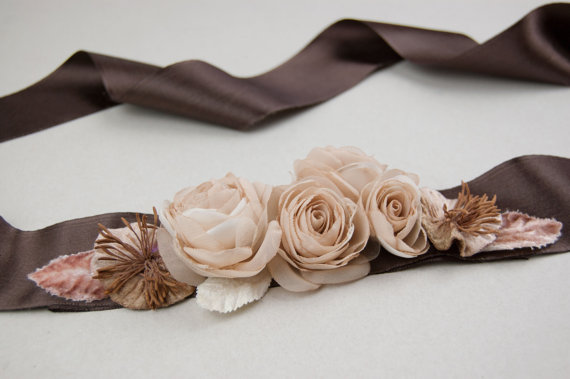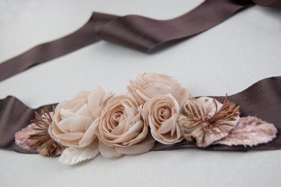 Pasek w ciemnym kolorze, ozdobiony jasnymi, sztucznymi kwiatami.