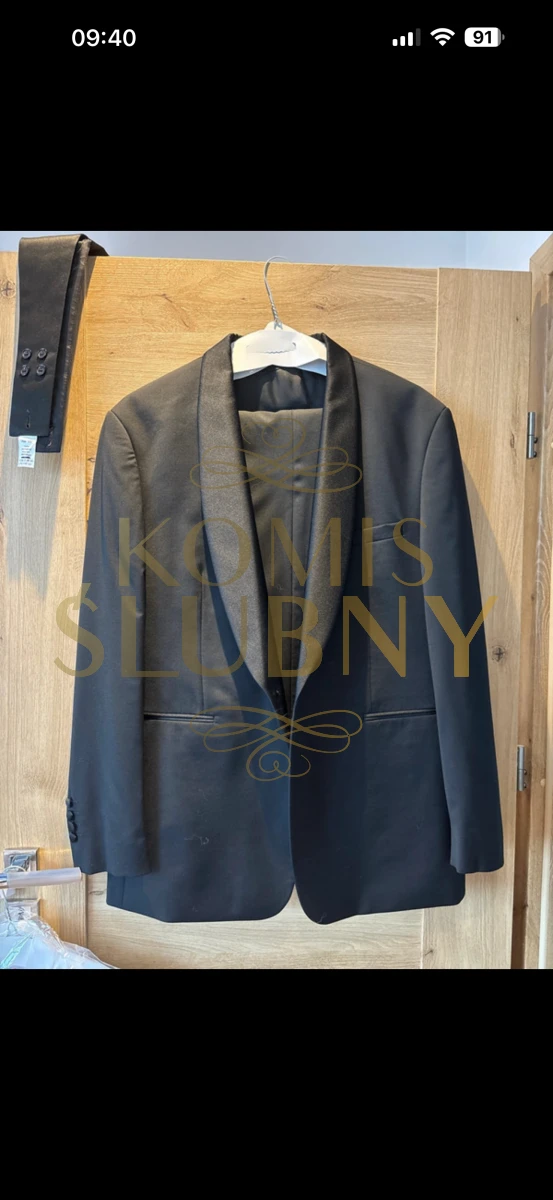 Ubrany raz na własnym ślubie, wyprany w pralni chemicznej. W skład smokingu wchodzi :