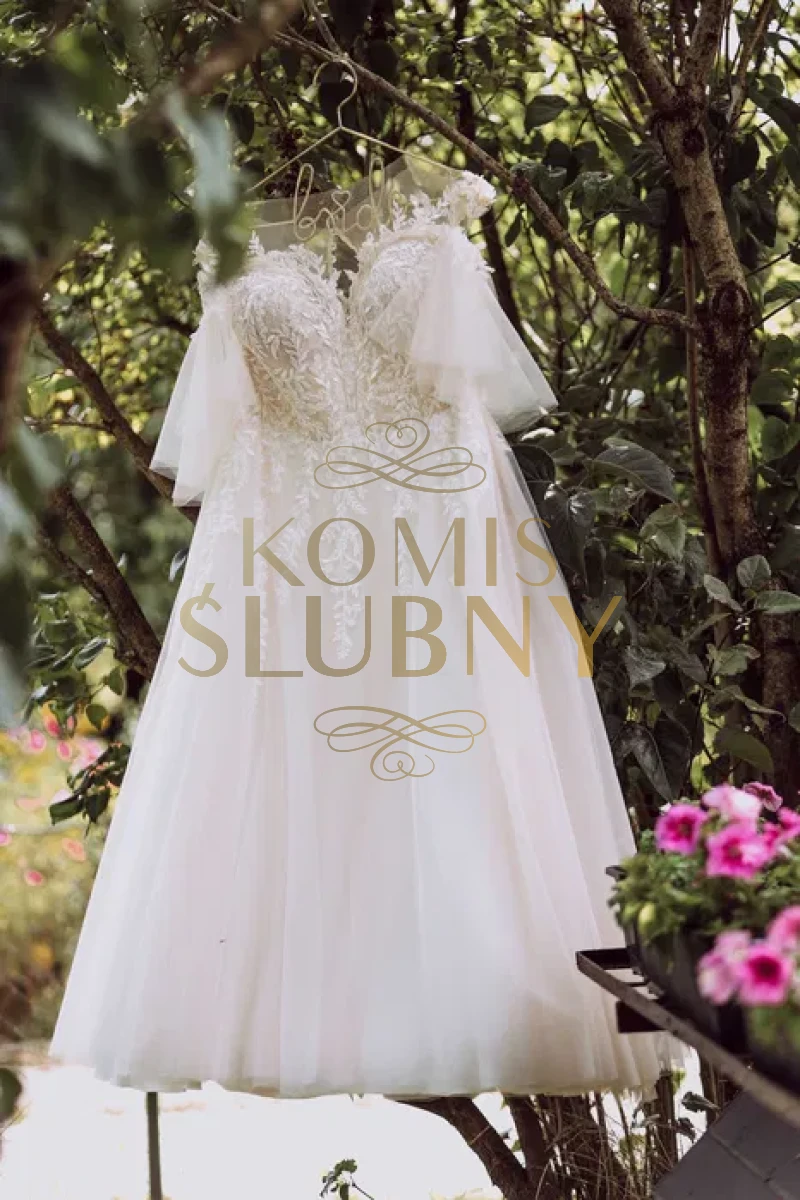 Suknia została profesjonalnie wyczyszczona chemicznie, jest w doskonałym stanie, gotowa na nową historię miłosną. Idealna dla Panny Młodej, która ceni sobie romantyczny styl, wygodę i subtelny blask.