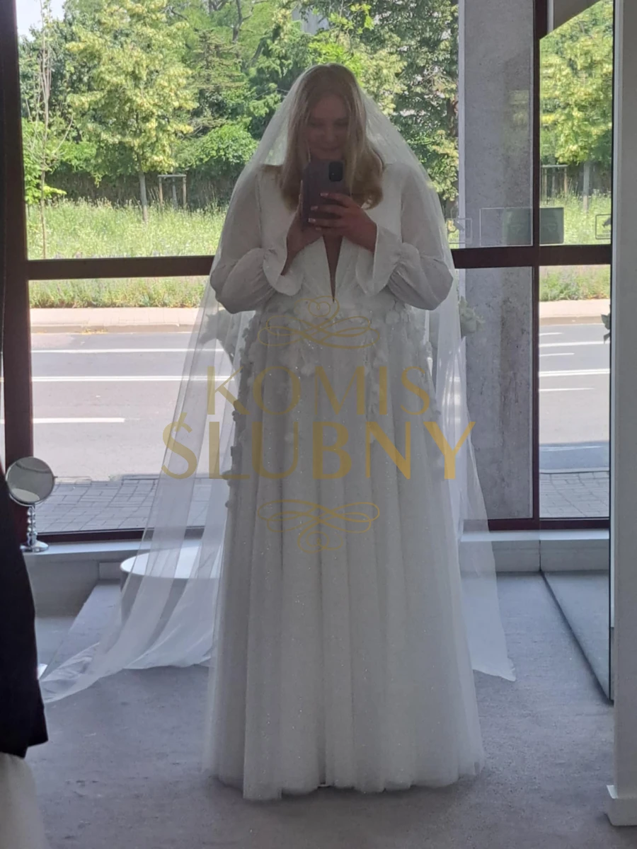 Z ogromnym żalem wystawiam swoją wymarzoną suknię ślubną od projektantki Katy Corso. Odkąd ją zobaczyłam, byłam zakochana. Suknia jest brokatowa, ozdobiona cudownymi kwiatami, z długim trenem (z możliwością podpięcia).