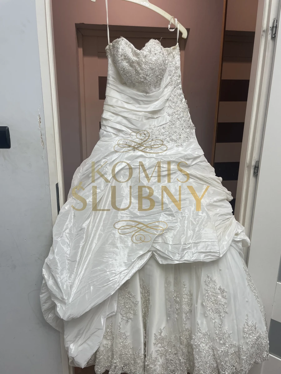 Stan sukni oceniam jako dobry. Została ubrana w dniu ślubu w 2014 roku. Suknia nie była poddana profesjonalnemu czyszczeniu, co zostało uwzględnione w bardzo atrakcyjnej cenie. Wymaga odświeżenia we własnym zakresie. Posiada normalne ślady użytkowania.