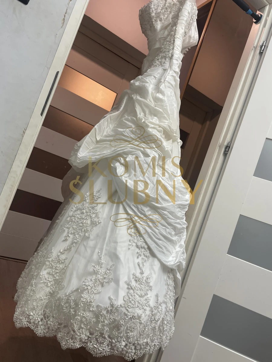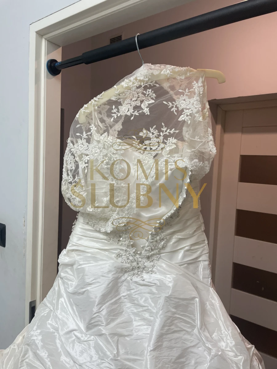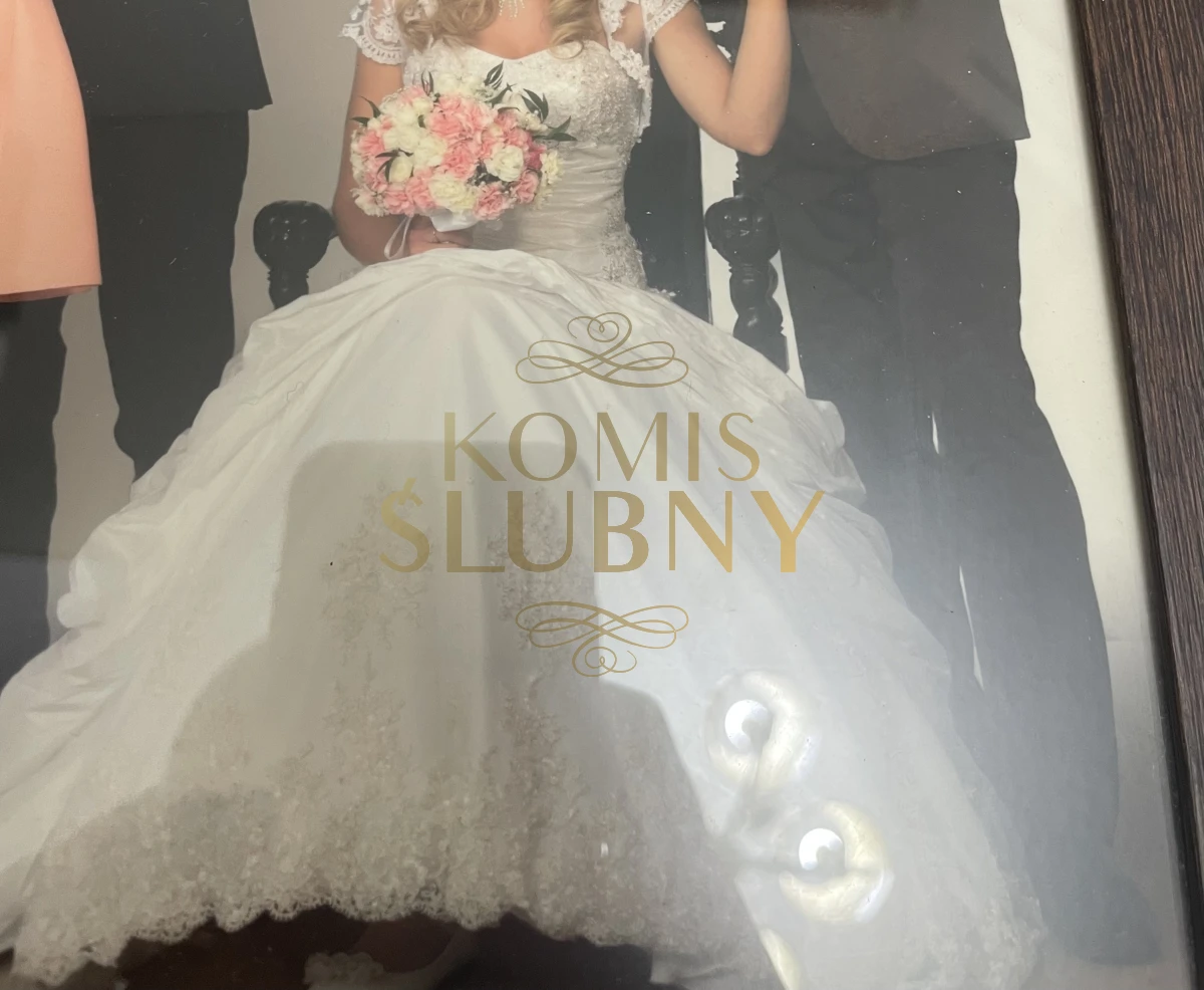 Mam na sprzedaż przepiękną suknię ślubną w klasycznym stylu księżniczki, w której poczujesz się absolutnie wyjątkowo. Suknia jest niezwykle efektowna i pięknie układa się w tańcu. Sprzedaję ją w komplecie z idealnie dopasowanym koronkowym bolerkiem.