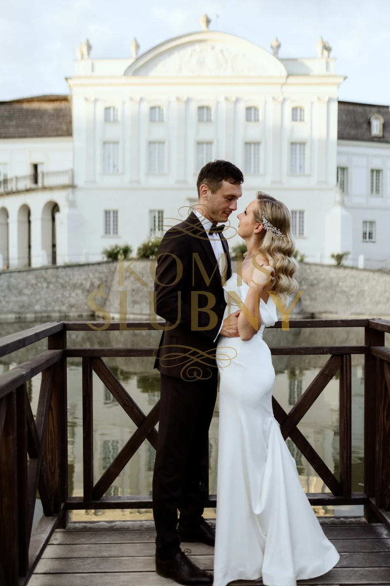 Dopasowany krój pięknie podkreśla sylwetkę, a dekolt bardot z opadającymi rękawkami subtelnie eksponuje ramiona i dodaje wyjątkowego uroku. Gładka tkanina wysokiej jakości + efektowny tren w tym samym materiale = ponadczasowy