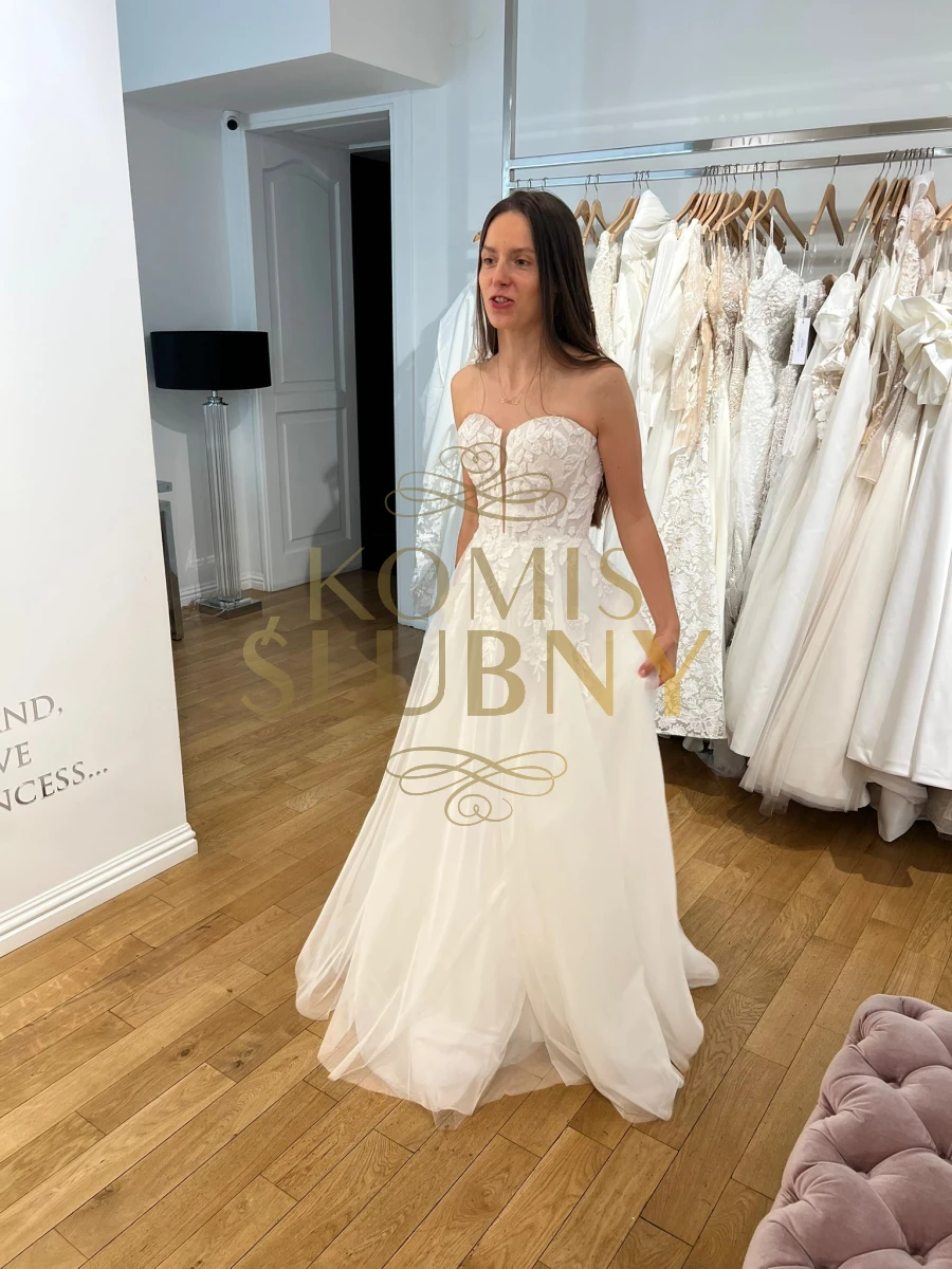 Przepiękna suknia ślubna z klejonymi aplikacjami kwiatowymi, wyszywanymi koralikami i pięcioma warstwami tiulu (jedna z mieniącym się brokatem, pod spodem znajduje się jeszcze jedna warstwa kryjącego białego materiału. Zapinana na gorset, ma odkryty dekolt i górną część pleców. Z tyłu na gorsecie znajdują się przezroczyste, okrągłe guziki. Ma również odpinane, tiulowe ramiona, które wyglądają bardzo romatycznie. Oprócz tego przezroczyste rozcięcie na nogę, przykryte jedną warstwą tiulu - zmysłowe i eteryczne. Przez środek gorsetu z przodu także przechodzi transparentne rozcięcie. Wyglądałam w niej zjawiskowo i szczerze polecam dla przyszłej Panny Młodej! Pięknie układa się w tańcu. Mój rozmiar to S/M, w zależności od sklepu. Suknia została kupiona w zeszłym roku w warszawskim Avenue|22, była oddana do pralni.
