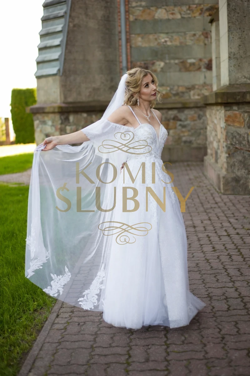 Sprzedam suknię ślubną w stylu romantycznym + długi welon z koronkowym wykończeniem.