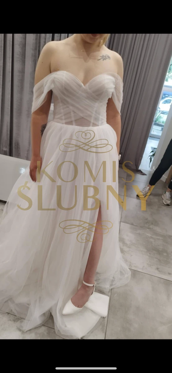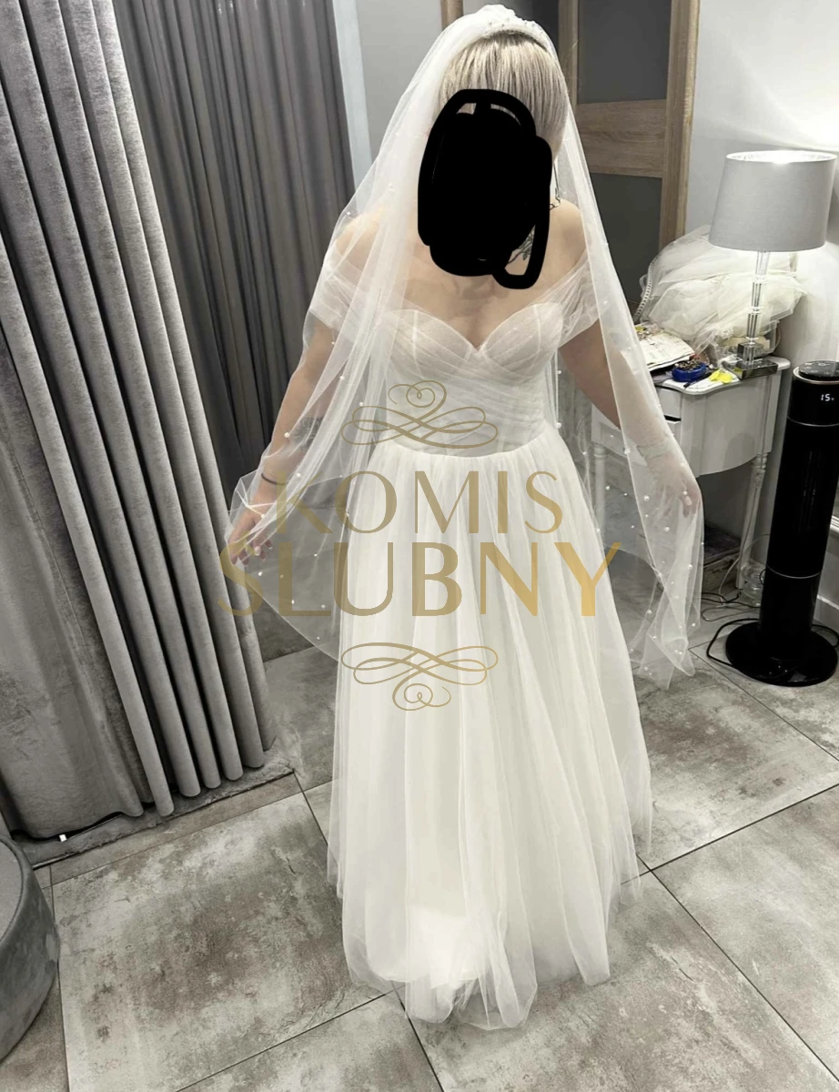 Mam do sprzedania przepiękną suknię ślubną, którą miałam na sobie tylko raz – podczas ceremonii oraz sesji plenerowej. Suknia jest w stanie idealnym, jak nowa. Została uszyta z dbałością o każdy detal, z wysokiej jakości materiałów. Jeśli osoba kupująca wolała by luźne ramiączka nie ma problemu wystarczy wypruć kilka nitek suknia się od tego nie zniszczy. Dodatkowym atutem sukni jest wewnętrzne zapięcie na cienką tasiemkę, którą zawiązuje się wewnątrz sukni, by dopasować ją idealnie do sylwetki. Tasiemka może być za każdym razem wymieniana – przy zdejmowaniu sukni wystarczy ją rozciąć. To praktyczne rozwiązanie pozwala na regulację – można ścisnąć suknię mocniej lub pozostawić luźniej, w zależności od preferencji. W dekolcie znajdują się dwie miękkie poduszki, które pięknie modelują biust. W razie potrzeby można je łatwo wyjąć – są wszyte w sposób umożliwiający ich bezproblemowe usunięcie. Do sukni dołączam tiul o dwóch długościach, zdobiony delikatnymi perełkami. Tiul (welon) jest długi, zmysłowo opadający aż do ziemi, a jego zapięcie (na niewidoczny guzik) znajduje się w połowie ciała. Całość prezentuje się niezwykle subtelnie i romantycznie. Suknia posiada dodatkową warstwę materiału w okolicy brzucha, dzięki czemu nie prześwituje. Idealnie podkreśla sylwetkę i zapewnia komfort przez cały dzień. Ze względu na sesję plenerową suknię należy odświeżyć – co jest zupełnie naturalne i nie wpływa na jej wygląd ani jakość.