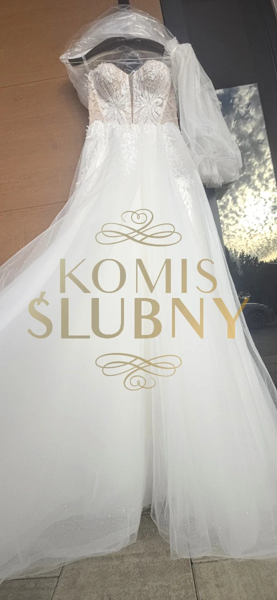 Rozmiar sukni to 36/38 dzięki wiązaniu, które jest ukryte za przepięknymi klejnotowymi guzikami.