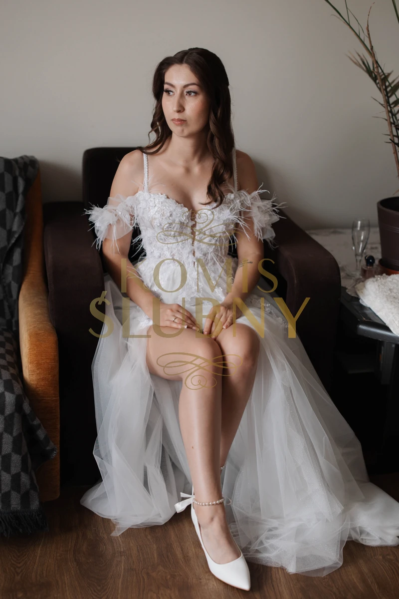 Sprzedam suknię ślubną szytą na wzrost 168 cm i obcas 7/9 cm. Suknia bogato zdobiona z piórkami, koralikami, cekinami. Spódnica do połowy uda, rozcięcie w tiulu na nogę. Bogato zdobione odpinane rękawy, ramiączka zdobione dodatkowymi koralikami. Suknia pięknie się mieni bo jest pokryta brokatem. Welon katedralny, z różyczkami i piórkami. Zakupiona w salonie sukien ślubnych w Olsztynie za 6 tysięcy.