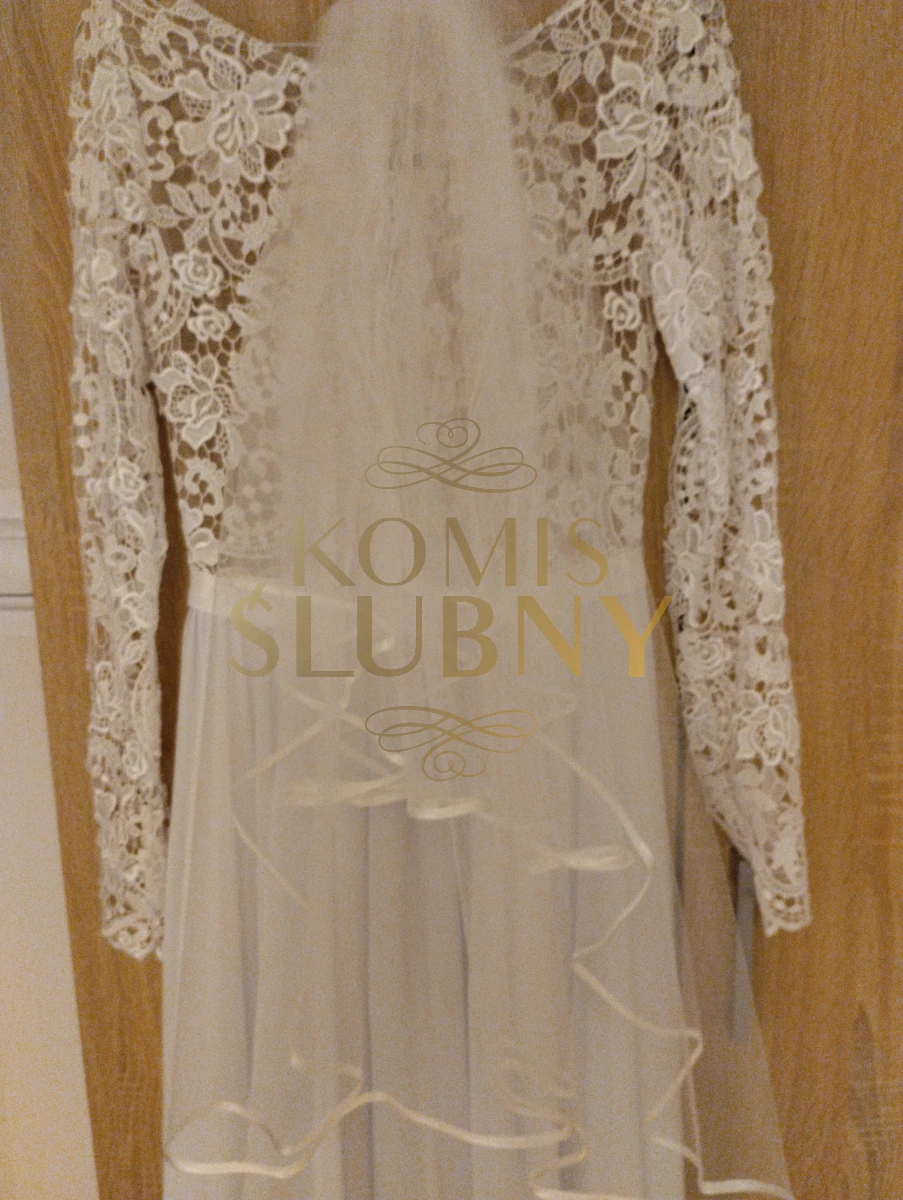 Oferuję na sprzedaż przepiękną suknię ślubną z koronkową górą i długim również koronkowym rękawem oraz genialnie układającym się muślinowym dołem.