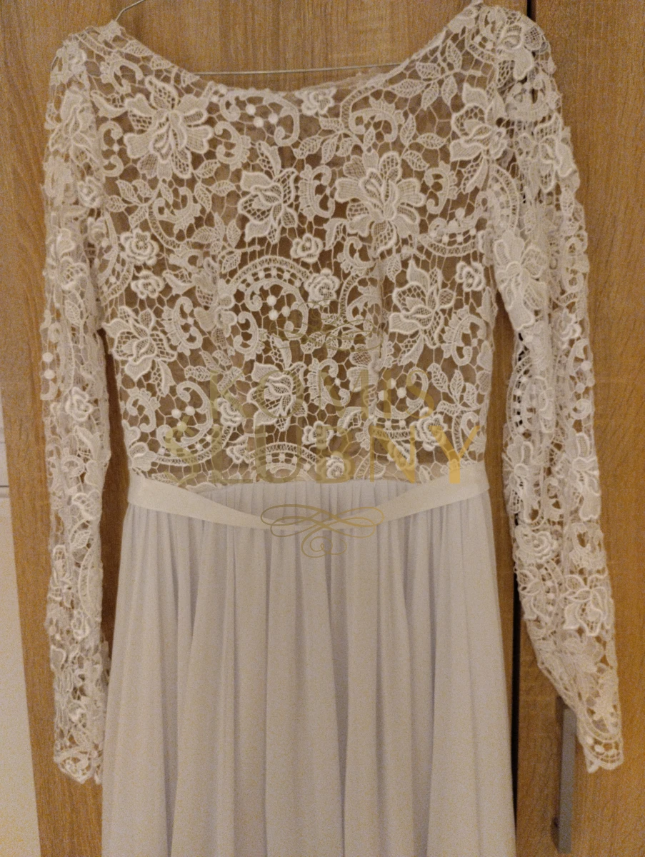 Oferuję na sprzedaż przepiękną suknię ślubną z koronkową górą i długim rękawem oraz genialnie układającym się muślinowym dołem.