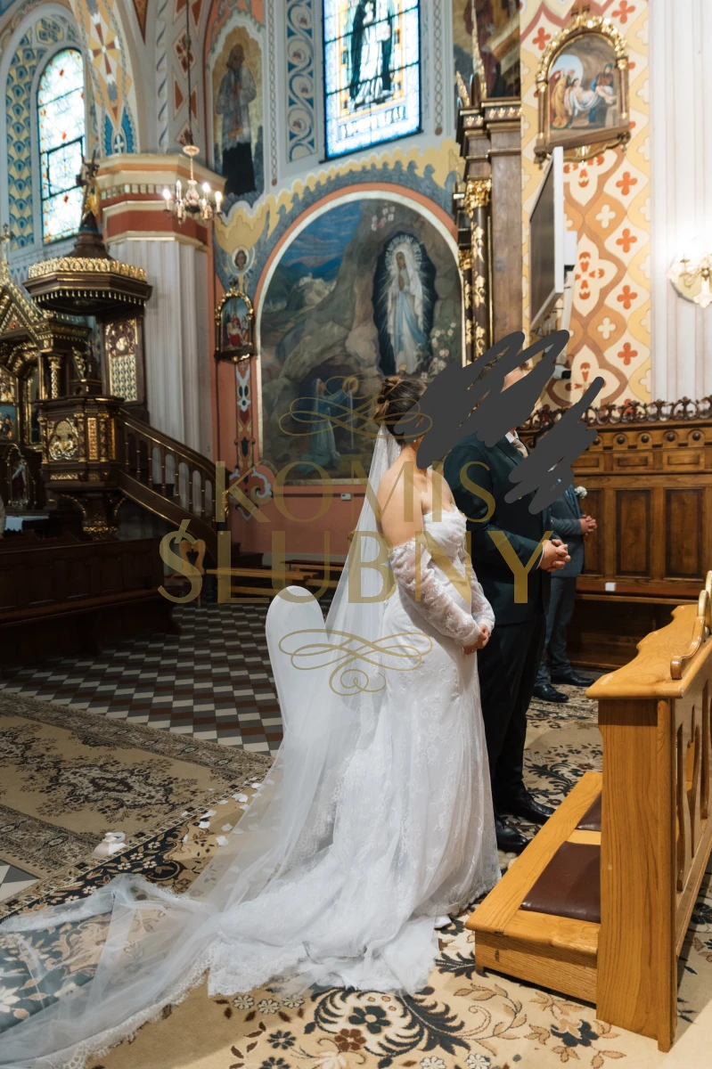 Bardzo wygodna i przewiewna z podpinanym trenem i rękawami. Dodatkowo dorzucam welon katedralny 3 m i szpilki które pasują do sukienki.