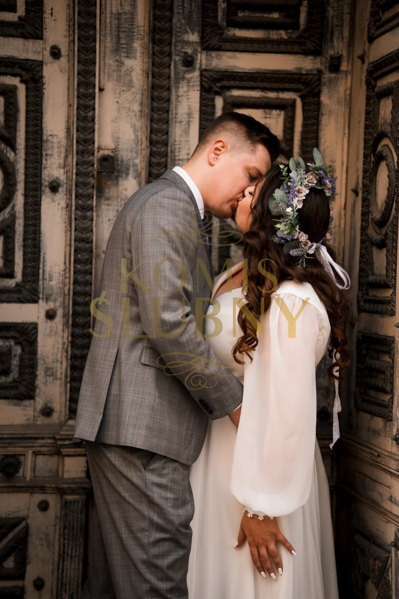 W talii znajduje się koronkowy pas, który optycznie wysmukla sylwetkę i nadaje sukni wyjątkowego charakteru.