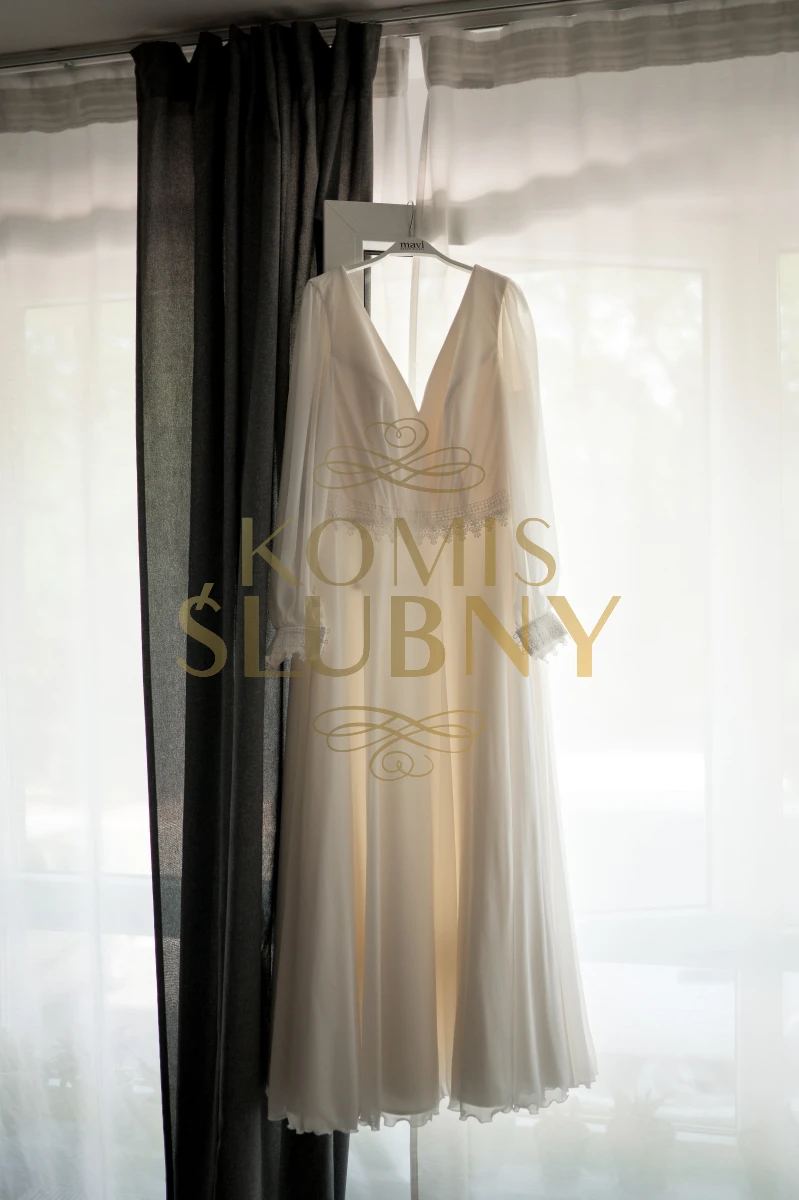 Model ma delikatnie rozkloszowany dół, który pięknie układa się w ruchu, oraz górę z głębokim, ale gustownym dekoltem w kształcie litery V, podkreślającym sylwetkę.