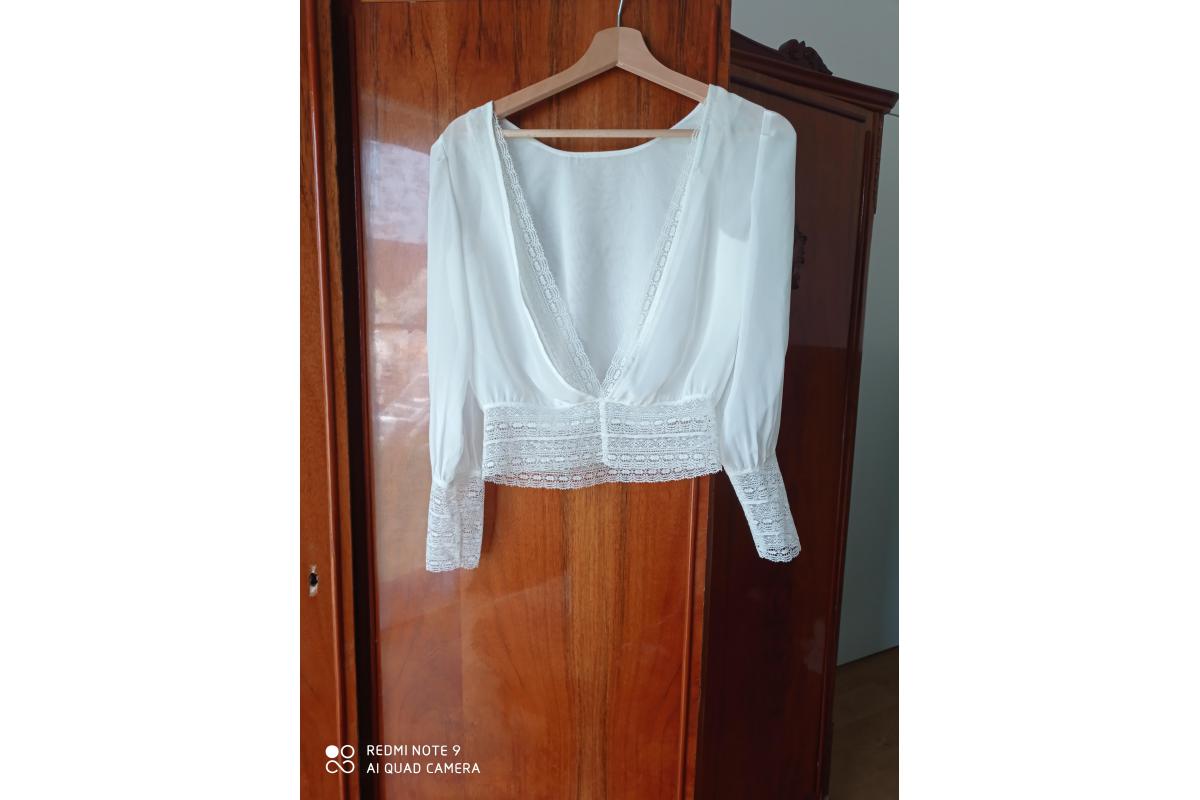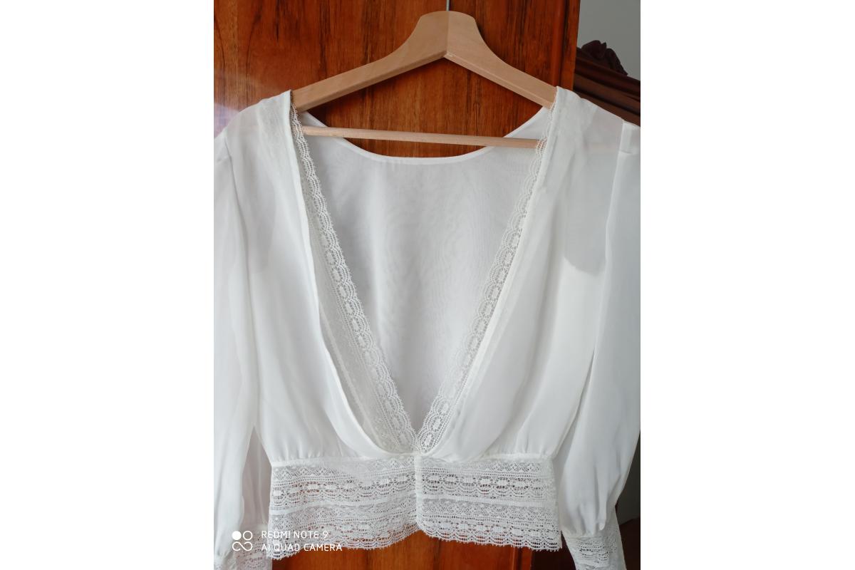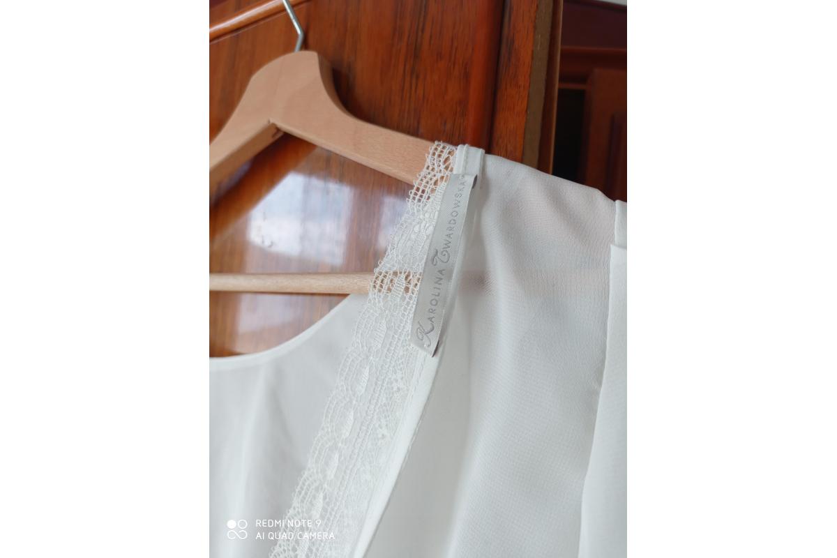Suknia ślubna projektantki Karoliny Twardowskiej. Kupiona w 2017r. Założona tylko raz w dniu ślubu. Suknia składa się z bluzeczki, spódnicy oraz halki. Brak uszkodzeń, stan jest idealny. Spódnica wykonana jest z pięknej koronki która również wykończona jest bluzka. Komplet jest w kolorze kremowej bieli.