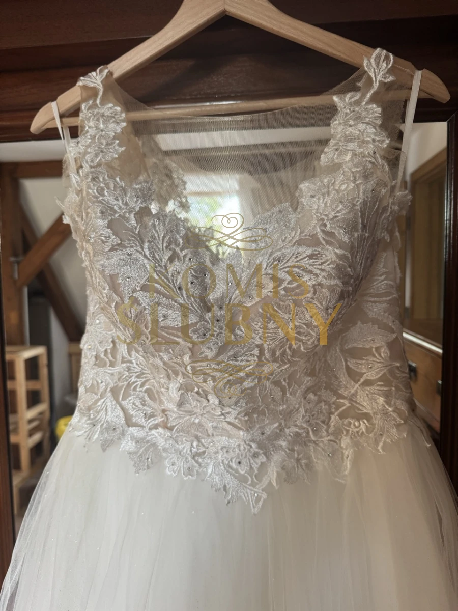 Wyprana, w świetnym stanie. Kilka warstw tiulu z czego jedna pokryta przepięknie mieniącym się brokatem. Kryształki na koronkowych listkach. Z tyłu zamek.