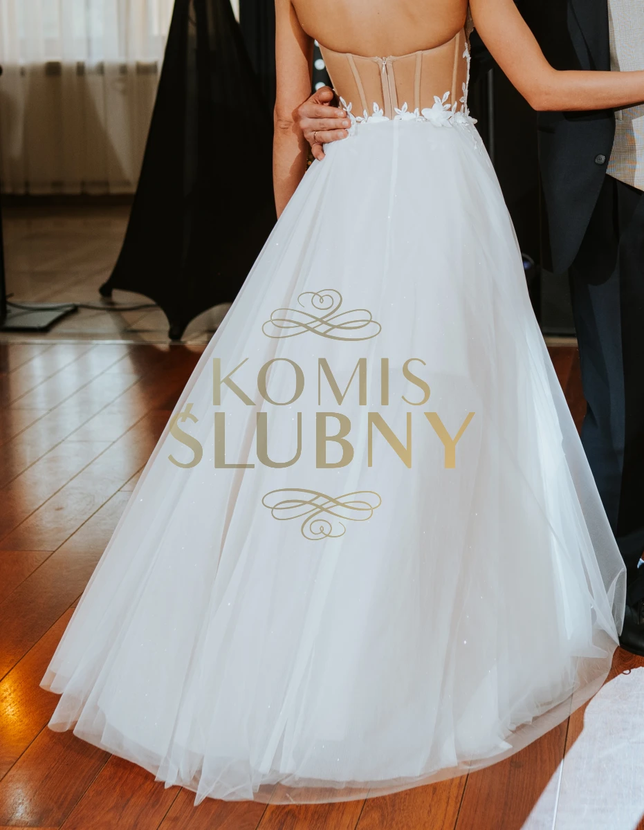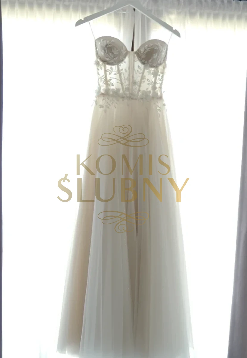 Suknia ślubna zakupiona w sezonie 2025 w prestiżowym salonie MAVERIE w Warszawie. Model LAURA wyróżnia się wyjątkowym odcieniem przełamanej bieli z nutą nude, który pięknie podkreśla karnację i nadaje stylizacji nowoczesną, subtelną elegancję. Suknia jest lekko prześwitująca – na moje życzenie wykonano do niej odpinaną halkę, dzięki czemu można dowolnie regulować stopień transparentności. Po jej zdjęciu delikatnie zarysowują się nogi, co dodaje sylwetce lekkości, a całej kreacji niezwykle zwiewnego charakteru. Dodatkowo w gorsecie wykonane zostało stylowe "rozcięcie" V, które sprawia że sylwetka ma lepsze proporcje, a talia jest węższa. To idealna propozycja dla Panny Młodej, która szuka połączenia delikatności, zmysłowości i perfekcyjnego wykonania. Suknia jest bardzo wygodna i lekka, szyta na wzrost 165 + 7 cm obcas. Posiada podpinany tren, fason jest na tyle uniwersalny, że po podpięciu tren wtapia się w suknię. Do miseczek wszyty został push up, można go jednak odpruć w razie konieczności. Stabilizacji dodają taśmy sylikonowe w gorsecie. Dodatkowo w zestawie jest katedralny welon w takim odcieniu jak suknia. Wymiary z piwreszej przymiarki widoczne za zdjęciu, jednak w trakcie kolejnych przymiarek suknia była zwężona o około 4-6 cm. Jest na szczupłą osobę XS lub XXS. Suknia została wyprana i czeka na kolejną właścicielkę, jest gotowa do ponownego użycia. :)