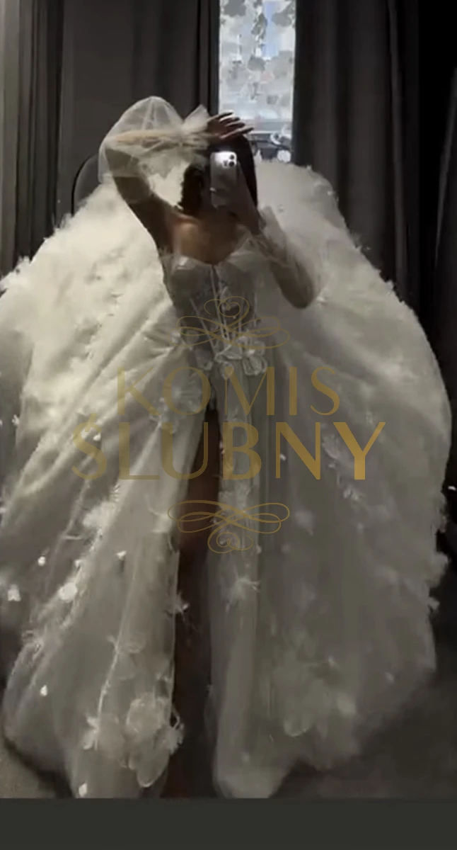 Sprzedam swoją suknię ślubną uszytą przez polską projektantkę Monikę Jankowską z kolekcji Aurora. Suknia została w 100% uszyta i przyozdobiona ręcznie, wszystkie zdobienia, dodatki są unikatowe i bardzo starannie dobrane. Suknia na żywo wygląda zjawiskowo ma ogromny (podpinany na diamentowy guzik oraz dwie haftki) tren, piórka, perły oraz kwiaty. Pod sukienka znajduje się połączone koronkowe body co tym bardziej powoduje, że jest jeszcze bardziej romantyczna. Dodatkowo zostały na stałe wszyte cieniutkie ukryte ramiączka które można założyć. Rękawki są częścią sukni, ale nie są w żaden sposób z nią połączone. Sukienka po mojej imprezie została wyprana ręcznie i schowana w pokrowiec, nie widać na niej żadnych śladów użytkowania. Jest w bardzo dobrym stanie. Dodatkowo w zestawie sprzedam biały tren z brokatem o długości 3m.