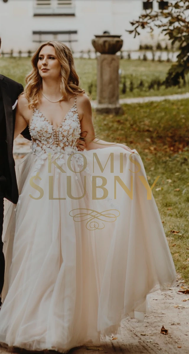 Suknia ręcznie wykonana, kwiaty 2D/3D. Wbudowany biustonosz. Ramiączka wykonane z przepięknych mieniących się kryształków. Z tyłu zapinana jest na zamek oraz jedną haftkę. Posiada również wycięcie na nogę.