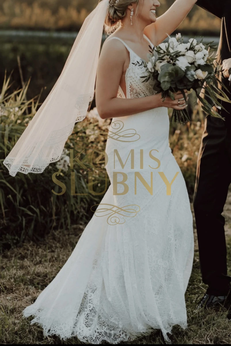 Sukienka o kroju rybki z efektownym dekoldem V z przodu i na plecach. Posiada ona również delikatny tren, który po podpieciu jest leciutki i nie przeszkadza w tańcu. Dodatkowo w sukience wszyte są poduszki na biust.