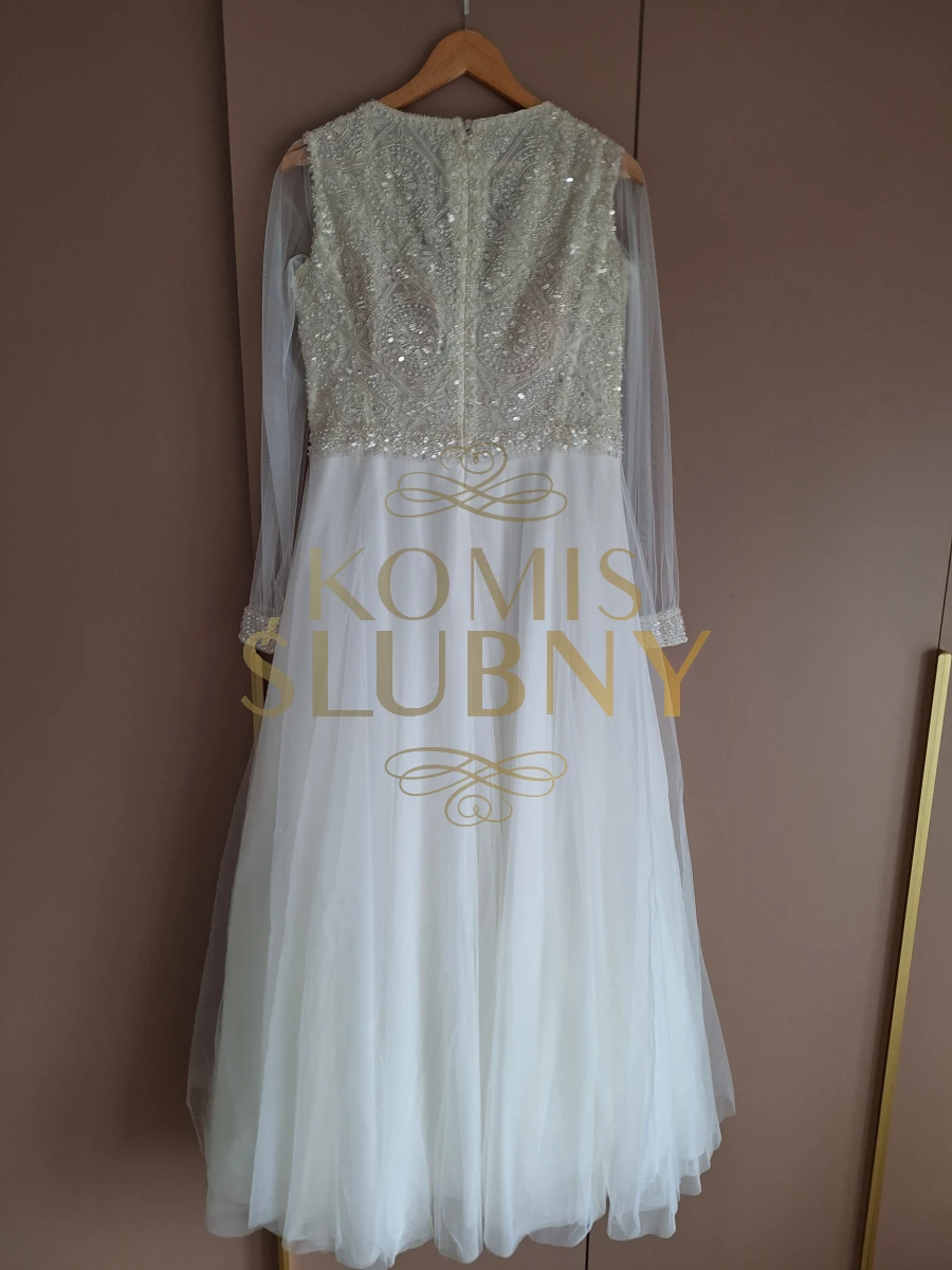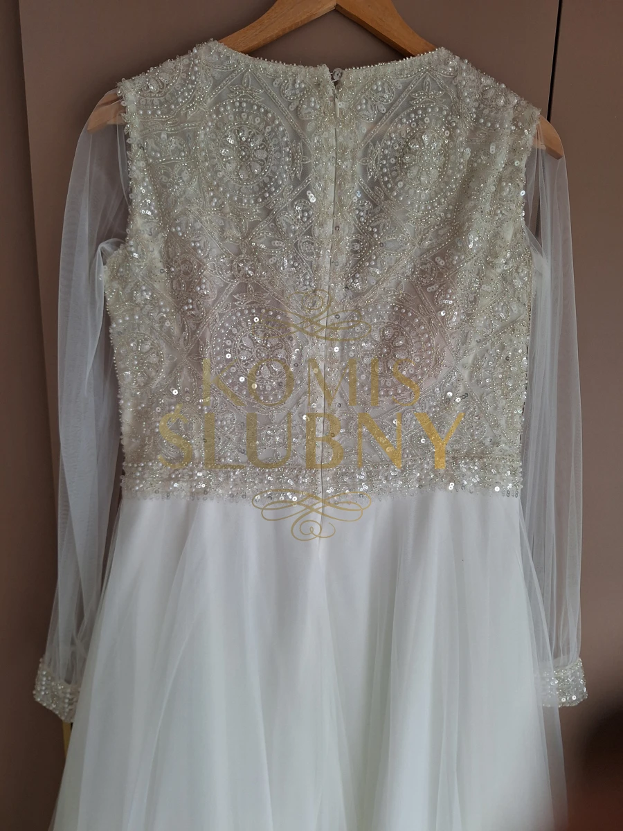 Sprzedam pięknie zdobioną suknie ślubną z 2025 roku. Suknia posiada odpinane rękawki. Szyta na miare w Grodzisku Wielkopolskim. Suknia jest po praniu chemicznym. Dól choć gładki to mieni się lekko brokatem.