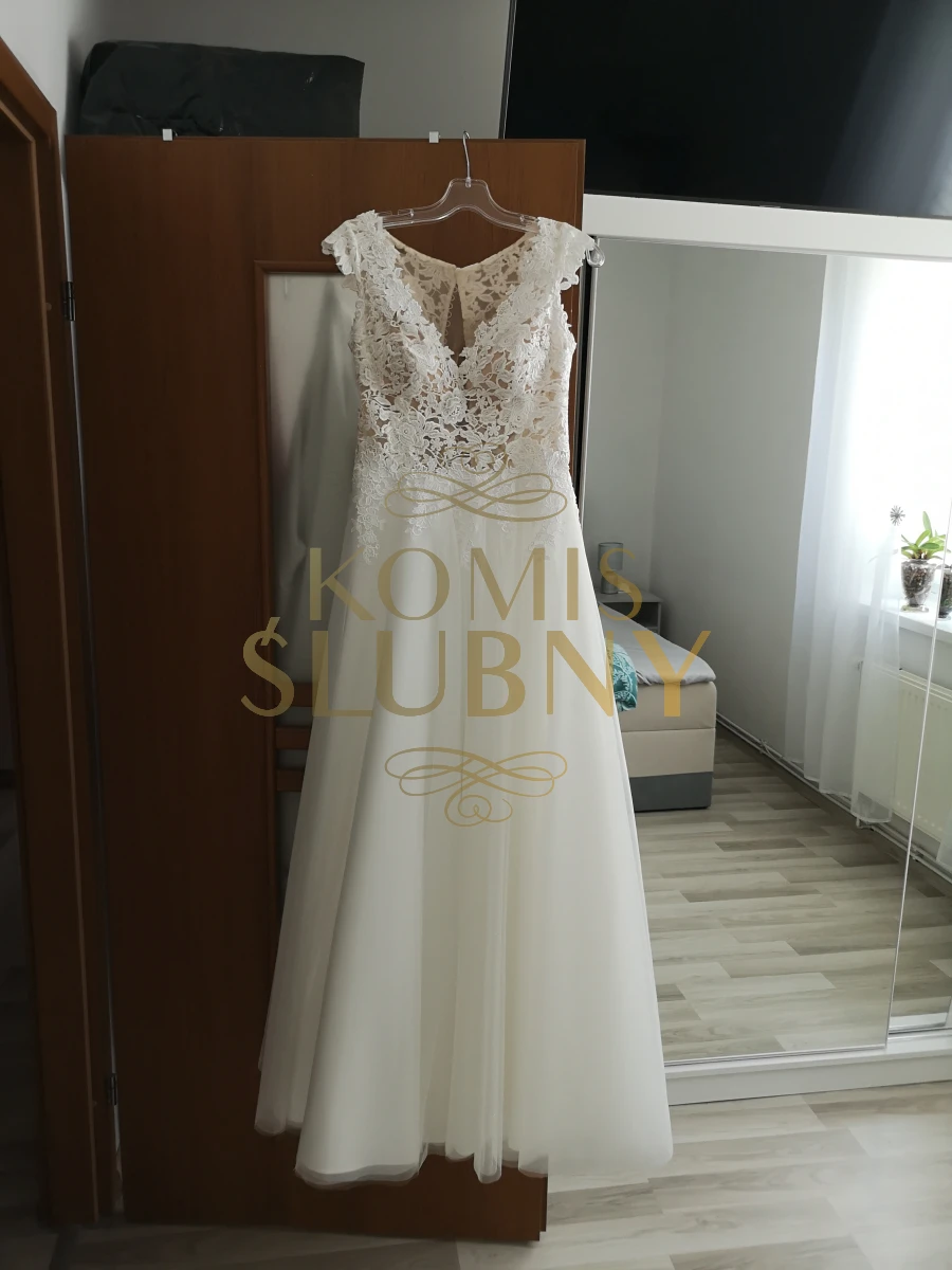 Suknia ślubna z delikatnym połyskiem i koronkową górą – rozmiar 38