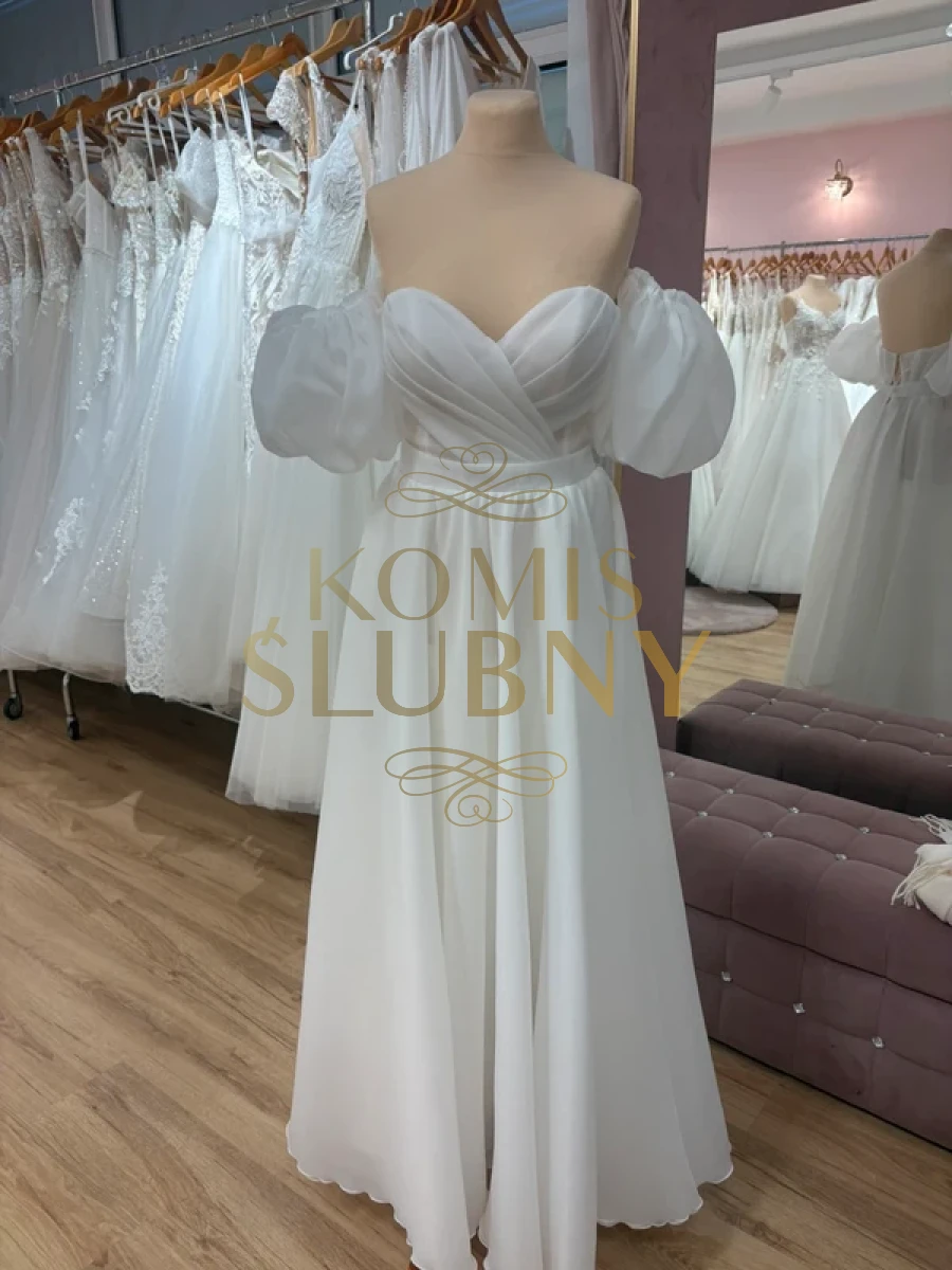 Mam na sprzedaż piękną, lekką klasyczną suknie ślubną z dodatkoymi bufkami na gumkę oraz z doczepianymi ramiączkami. Suknia ma piękny rozporek. Suknia jest jak nowa, dlatego zaznaczyłam taką opcję. Czysta, pachnąca prosto z salonu czeka na przyszłą Pannę Młodą. Jeśli Panna Młoda będzie z Olsztyna lub okolic, to salon sukien ślubnych w Olsztynie zrobi poprawki :) Wymiary: Biust - 86 Talia - 68 Wzrost 168 + 6 cm obcas