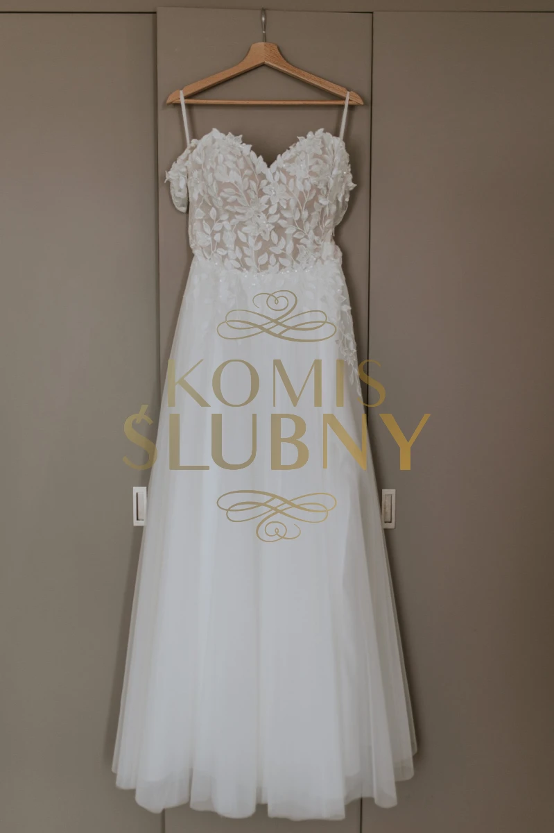 Delikatna koronka przechodzi z gorsetu na tiul na spódnicy.