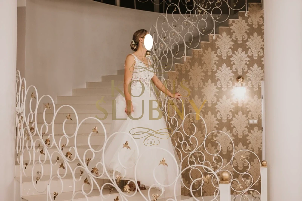Suknia na kole w kształcie litery A na wzrost około 165 cm wzrostu + obcas 11cm (miałam dwie pary butów z takim obcasem). Dzięki gorsetowi i odpowiednio ułożonym kwiatom 3D pięknie wyszczupla sylwetkę i niweluje szerokie biodra. Suknia jest bardzo lekka i wygodna. Bez problemu można ją skrócić. Suknia dość wąska w talii. Ma wszyte gąbki w miseczkach, które można usunąć.